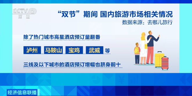 旅行社负责人介绍,今年国内出游人数同比增长约130%,新疆、内蒙古、甘肃等因秋景正盛,产品尤为抢手。与此同时,国内旅游趋势正向品质化、小城化发展。据旅游平台数据显示,除了热门城市高星酒店预订量翻番,泸州、马鞍山、宝鸡、武威等三线及以下城市的酒店预订增幅也跻身前十。